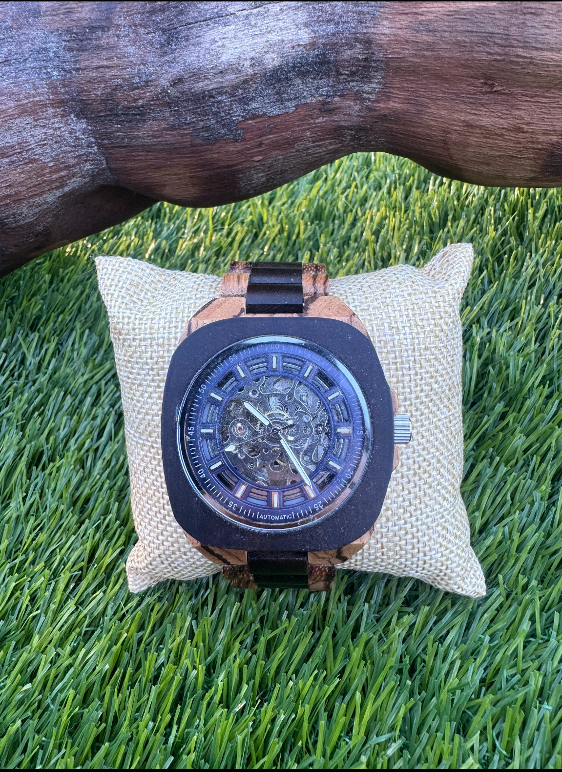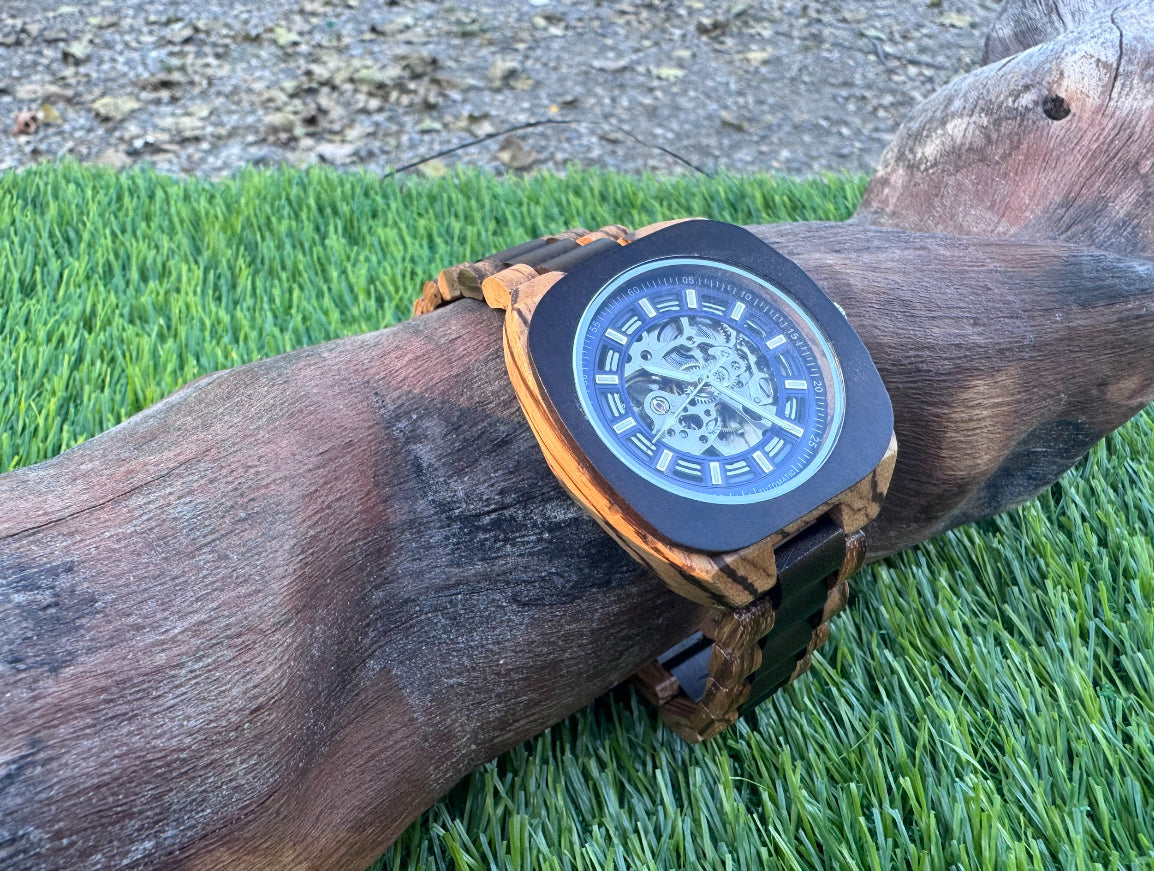Montre automatique en bois d’Olivier et d’ébène avec cadran bleu et mouvement, visible avant arrière